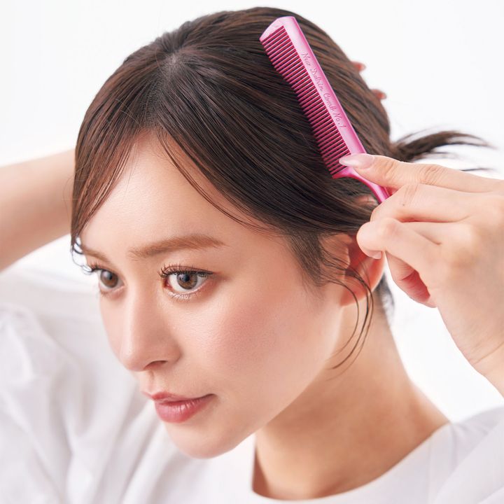 5.トップやサイドの髪をコームでなでつけます。まだ浮き毛が気になるなら、セット剤を表面につけ足してとかして。