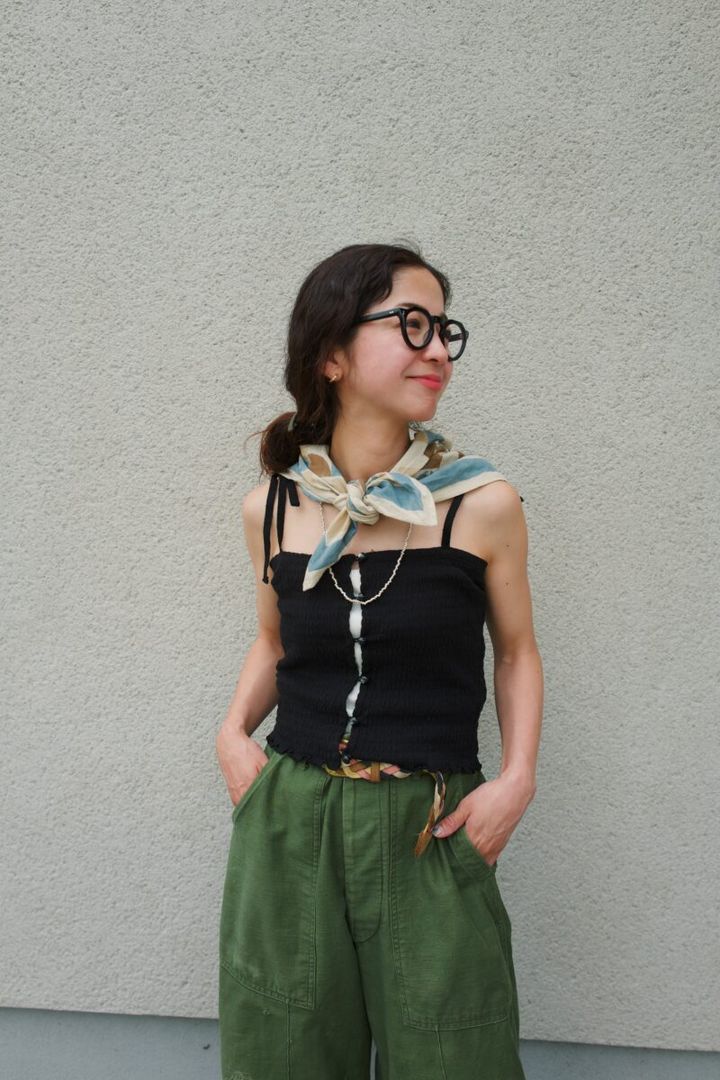 「ミリタリー色の強いパンツに黒のキャミをあわせた、シンプルなスタイリング。そこに柄入りスカーフをプラスして、ポイントにしました。肩まわりの肌感をナチュラルにカバーできるので、夏コーデのアレンジに活躍します!」(PURデザイナー 八木下泉さん) パンツ/used