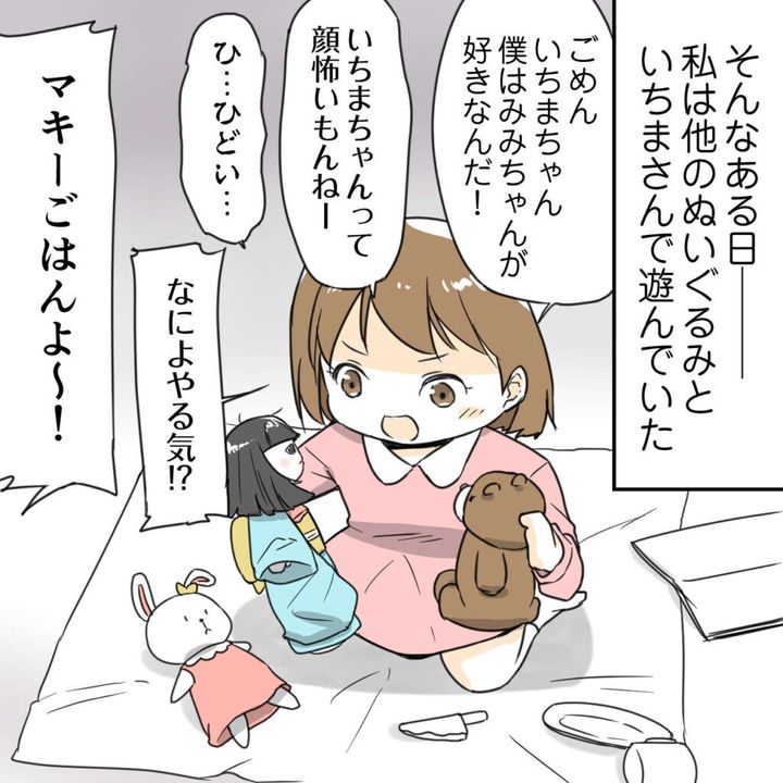 ある日、私はお気に入りのぬいぐるみといちまさんで、おままごとをして遊んでいました。お人形遊びの時、いちまさんはいつも少し残念な役どころ。だって、顔が怖いんだもの。