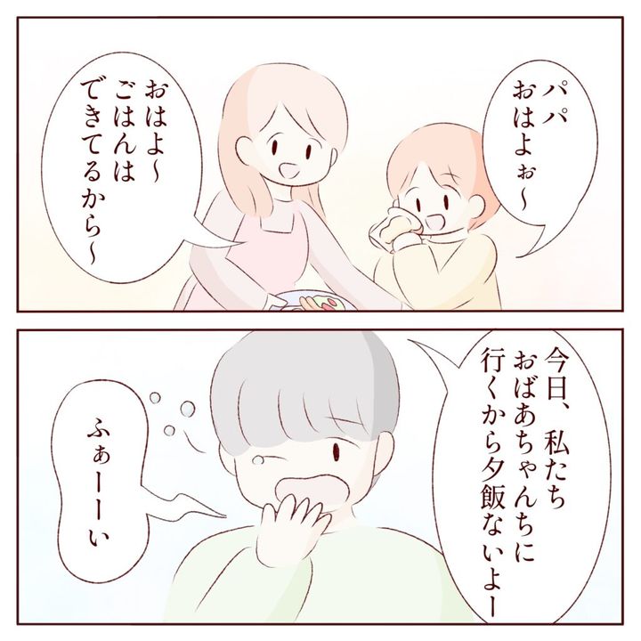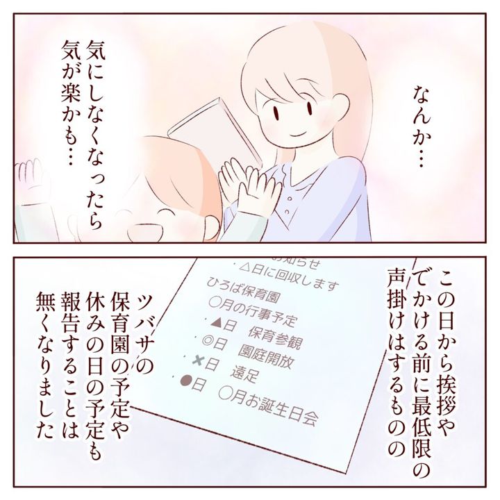 私は、カズキを気にしないようにしてから気が楽になりました。この日から挨拶やでかける前に最低限の声掛けはするものの、ツバサの保育園の予定や休みの日の予定も報告することは無くなりました。
