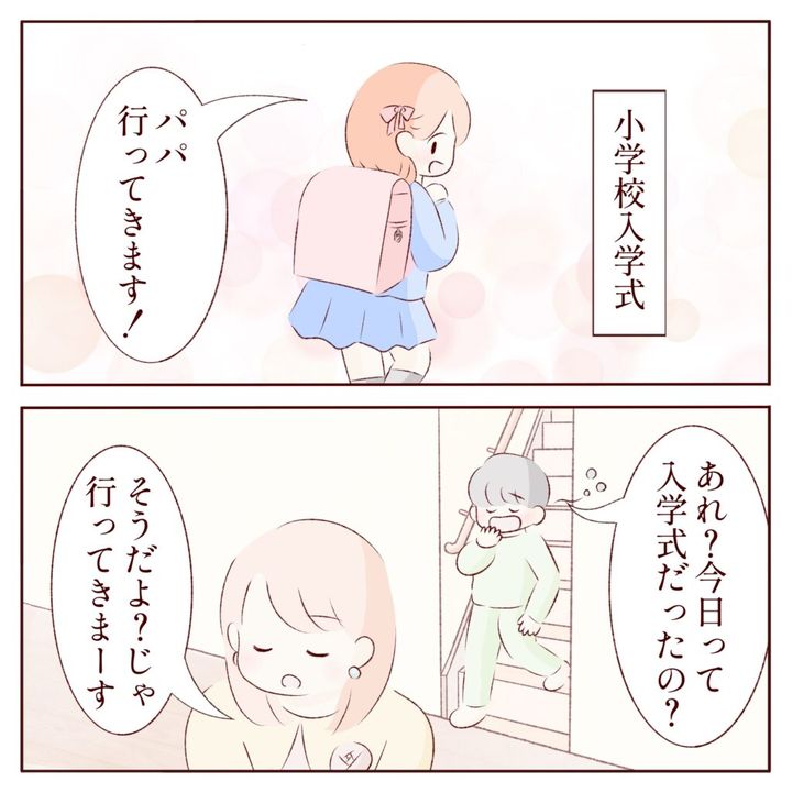 そして迎えた小学校入学式。新しいランドセルを背負ってルンルンで「パパ行ってきます!」というツバサ。起きてきたカズキは「あれ?今日って入学式だったの?」と口に手を当て言いました。私はカズキを見ずに「そうだよ?じゃ、行ってきまーす。」と言って家を出ました。