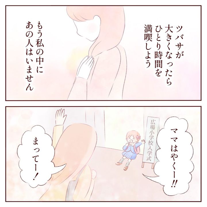 ツバサが大きくなったらひとり時間を満喫しよう。もう、私の中にあの人はいません。小学校の門から「ママはやくー!!」と元気なツバサの声。私は「まってー!」とツバサの元へ走りました。