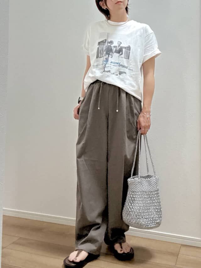 白のプリントTを合わせたカフェオレ配色は、柔らかさと洒落感を両立してくれる万能コンビ。Tシャツの裾をフロントインしたり、袖をラフにまくったりと、ちょっとした工夫でこなれ感が倍増。大人カジュアルを洗練させるうえで、まさに頼れる1本です。