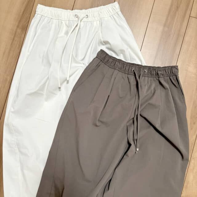 ウエストはゴム仕様で着脱もスムーズ。タック入りで腰回りに余裕がありつつ、裾にかけて緩やかにすぼまるバレルラインが脚をキレイに見せてくれます。