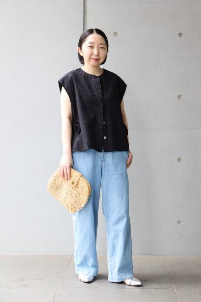 「カットソーよりもしっかりした素材感で、涼しさもありつつ上品さが保てるノースリーブブラウスやベストは夏のマイ定番。デニムパンツと合わせてカジュアルダウンし、シルバーサンダルで今年らしいムードをプラスしました」