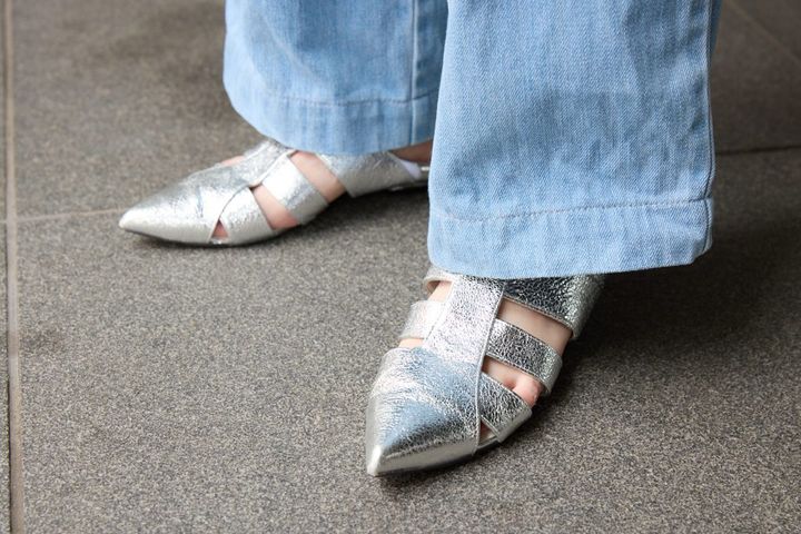 「かかとを踏んでバブーシュとしても履けるフラットシューズは、シルバーの素材感と抜け感のあるデザインに惹かれて購入。シルバー合わせで夏の黒コーデをさわやかに楽しみたいです」
