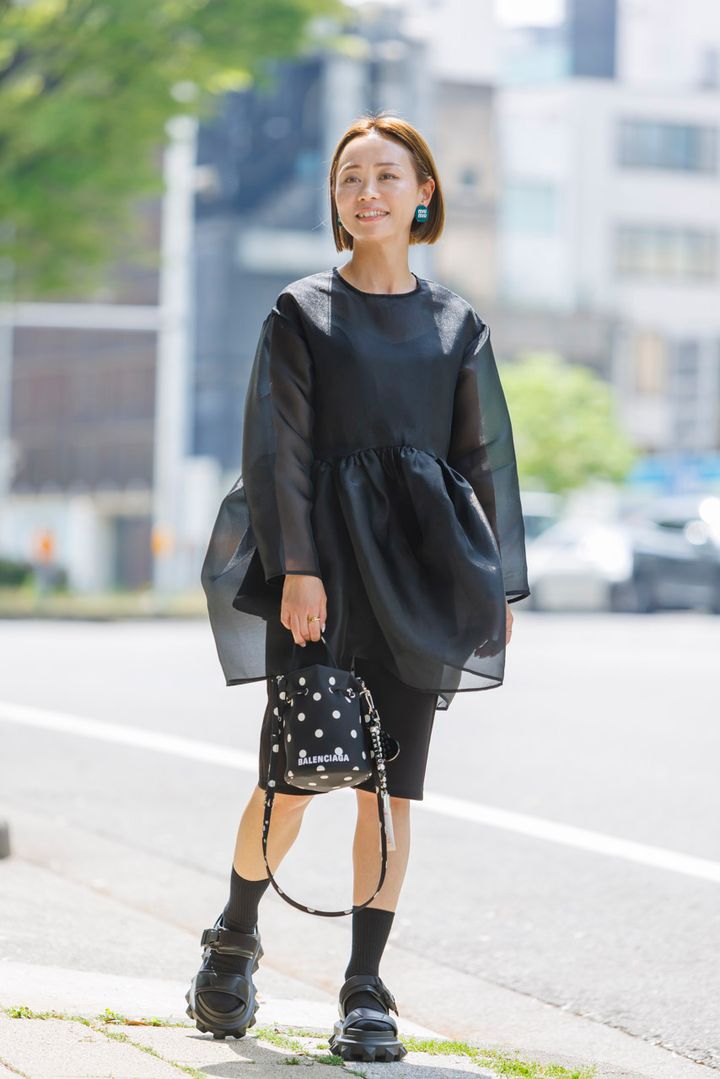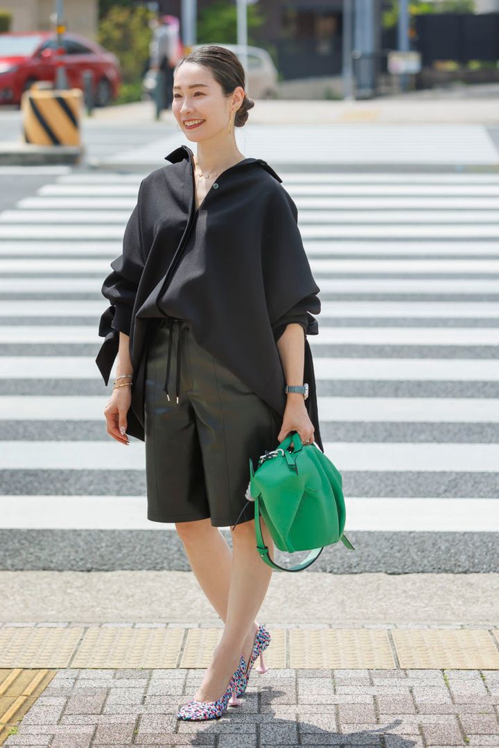 ハーフパンツはあわせるアイテムによって表情を大きく変えられるところが好き。あえて上下とも黒にして素材感の違いを楽しめるコーデにしました。黒だけだと無難になってしまうので、バッグと靴は色とデザインで遊びを入れたのもポイントです。