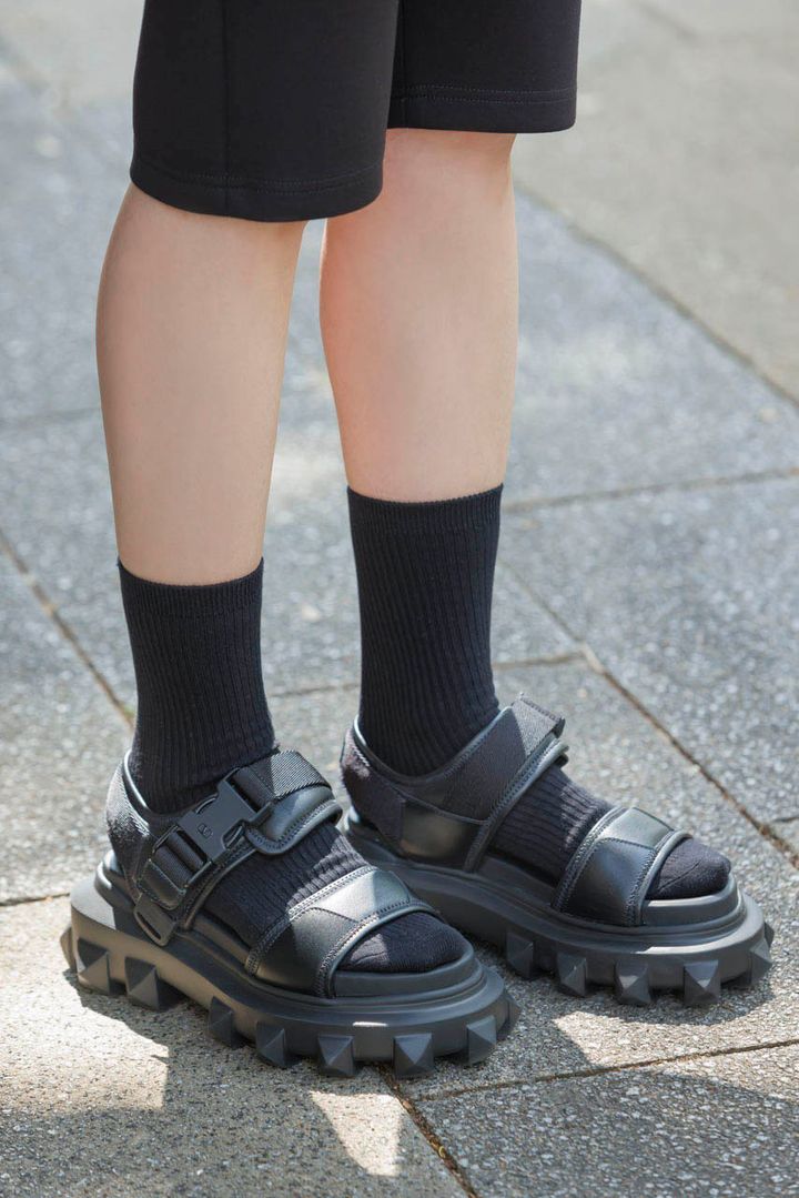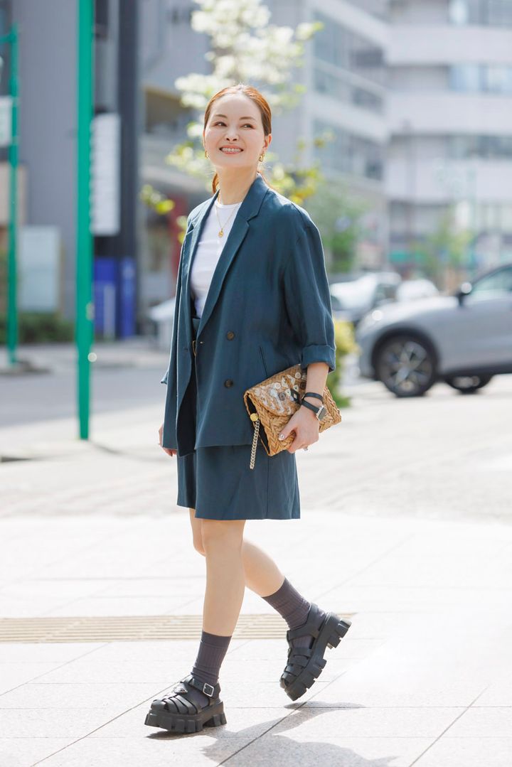 オーバーサイズのトップスやジャケットが好きなのですが、身長が低いので合わせるボトムの丈感が難しく悩んでいました。ハーフパンツを合わせてみるとスッキリまとまり、買って以来、大活躍! トップスのボリュームに負けないよう、ボリュームサンダルとTOKIDOKIのソックスを合わせました。