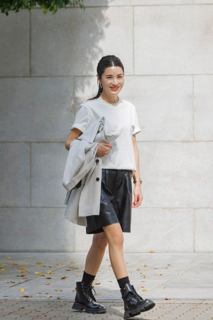 Tシャツにレザーハーフパンツでエッジを効かせたスタイルに