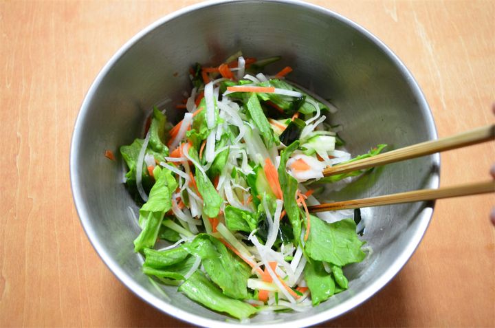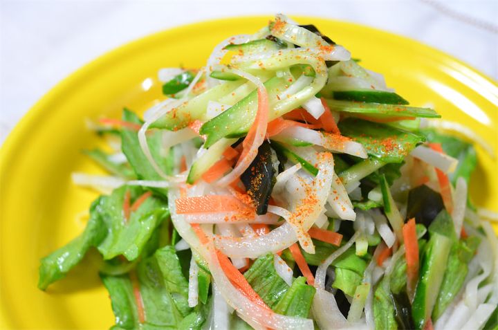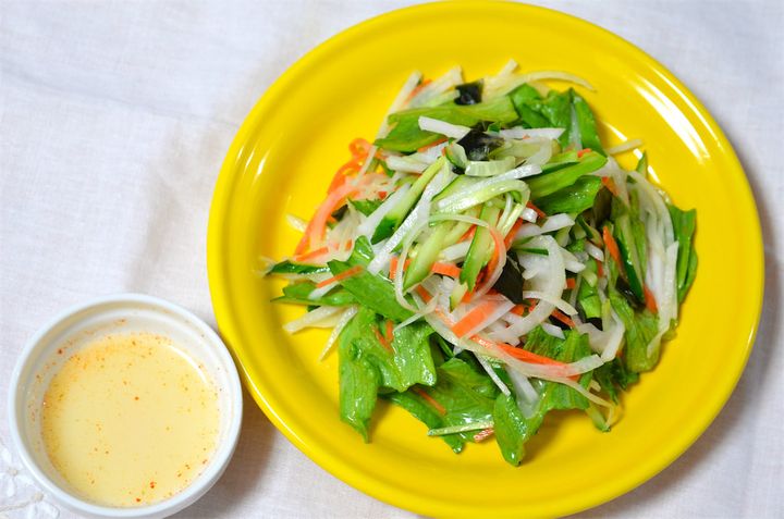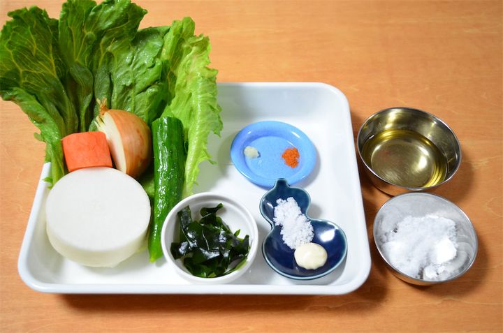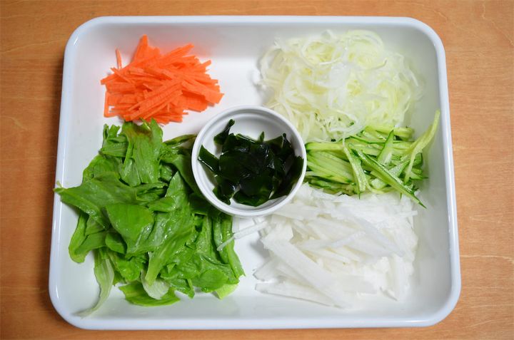 1. 玉ねぎは薄切り、にんじん、大根、きゅうりは千切り、レタス、わかめは食べやすい大きさに切り揃える。