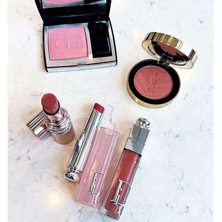 チークはくすみピンクで大人可愛くなるYSL メイクミーブラッシュ パウダー 06とヘビロテ中のディオールスキン ルージュ ブラッシュ 212の2択。プルプル唇になるディオール アディクト リップ マキシマイザー 012の上に、リップ グロウ 074とYSL ラブシャイン キャンディ グロウ バーム 88を重ねます。