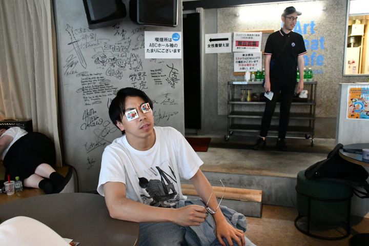 【出番終わり、お笑いグランプリのステッカーを目に貼るフースーヤ谷口理さん】