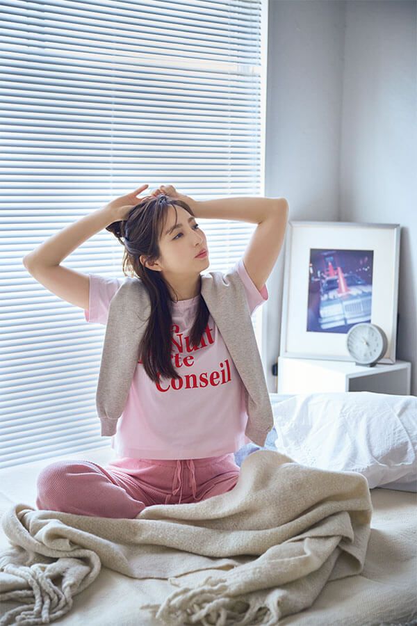 淡いピンクトーンのおうち着で、ラクちんでも可愛らしさは忘れずに