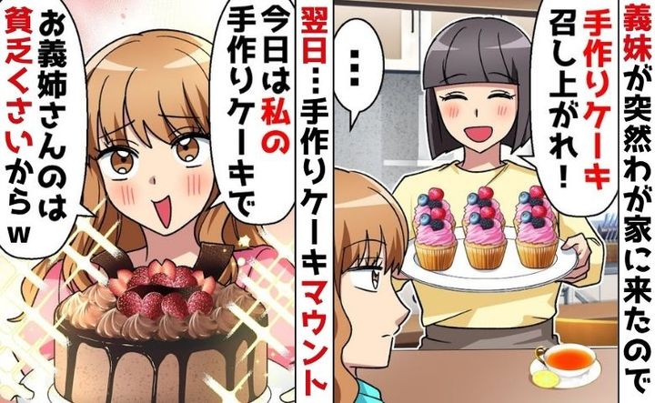 その翌日、義妹は私の夫のために、手作りケーキを持参してわが家へやってきました。夫に「お義兄さんのために作ってきたんです♡」とほほ笑み、「私って料理上手で家庭的なんです〜♡」とアピールする義妹。私が昨日、手作りのカップケーキを出してくれて、自分も作りたくなったと夫に言っていましたが、私には小声で「お義姉さんの貧乏くさいケーキはちょっとね」とマウント。