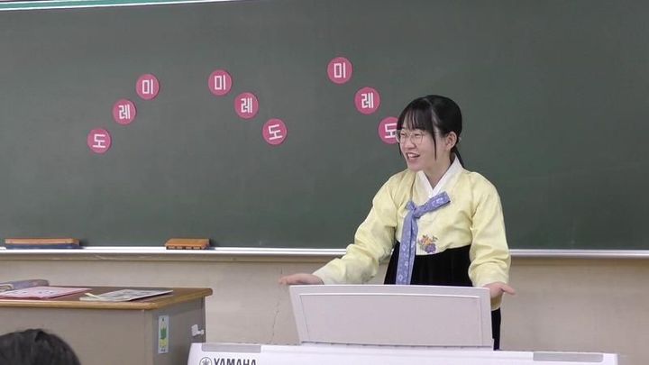 女性の教員が身に着けているのは、民族衣装のチマチョゴリです。