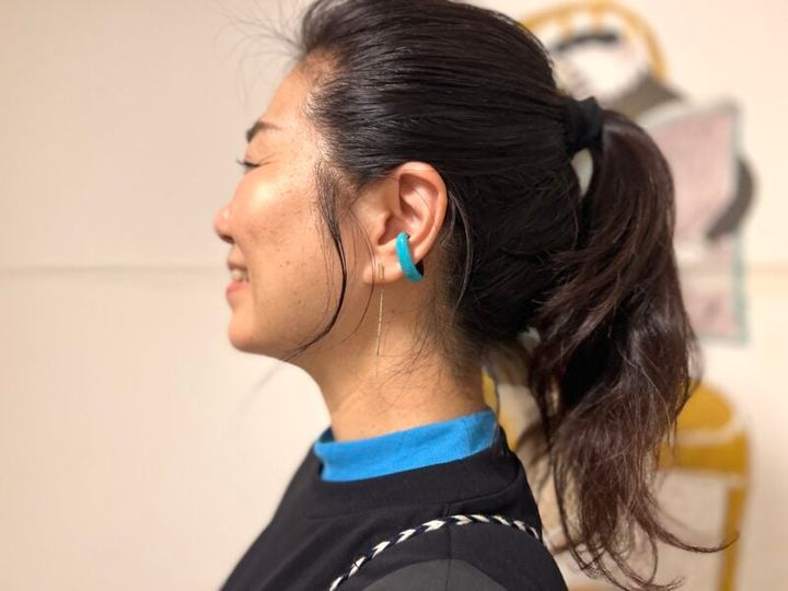 首元にチラリと見せたインナーの明るいブルーがとてもおしゃれ!コーディネートしたのは、京都のセレクトショップ「ririchuchu(リリチュチュ)」のバッファローンホーンのイヤーカフ。初対面の場や打ち合わせのシーンでも、クリエイターとしての個性を演出できそうです。