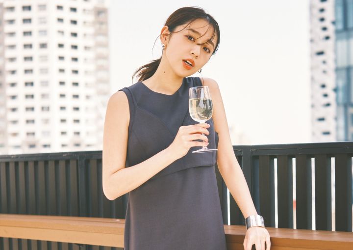 オケージョン服としてもしっかり映えてくれるナローワンピース。セットのビスチェが脚長バランスに見せてくれるので、アクセ少なめでもレディなムードに。存在感抜群なバングルは、腕を出す夏場に1つあると便利。