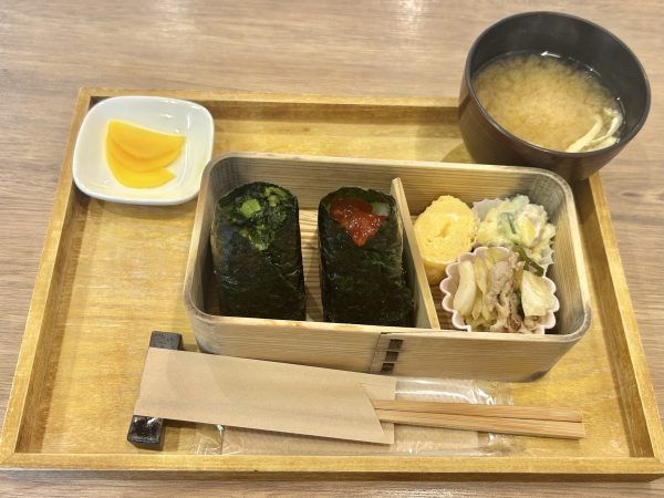 私は「筋子」と「青高菜」のおむすびをいただきました。そしてこの日のお惣菜は、卵焼き、野菜炒め、ポテトサラダです。