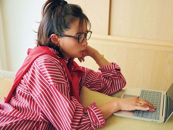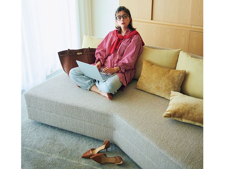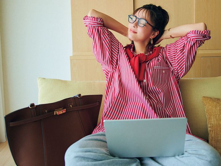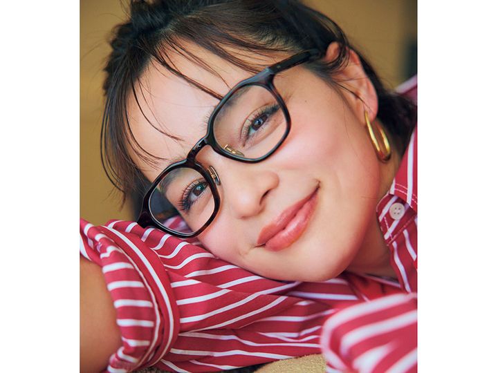シャツ¥25,300(プロヴォーク/ノーブル 有楽町マルイ店)カーディガン¥26,400(マルティニーク/マルティニーク ルミネ横浜)スウェットパンツ¥8,910(ビーミング by ビームス/ビーミング ライフストア by ビームス ららぽーとTOKYO-BAY店)バッグ¥26,400(アンドミューク/アマン)パンプス¥140,800(フランチェスコルッソ/トゥモローランド)メガネ¥38,500(ブラン/ライト)ピアス¥18,700(チビ・ジュエルズ/チビジュエルズ・ジャパン)ネックレス¥7,920(アプロ/ロードス)バングル¥34,980〈ソコ〉リング[右手人差し指]¥4,620リング[右手薬指] ¥9,680〈ともにフル・オブ・グレイス〉(すべてズットホリック)