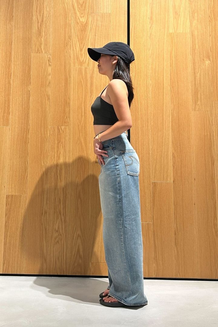 黒のブラトップは、露出があっても安心感のあるカラー。ハイウエストのワイドデニムと合わせると、肌は見せていても全体はきちんと締まって見えるから不思議。キャップを合わせることで、よりスポーティでアクティブなムードに。