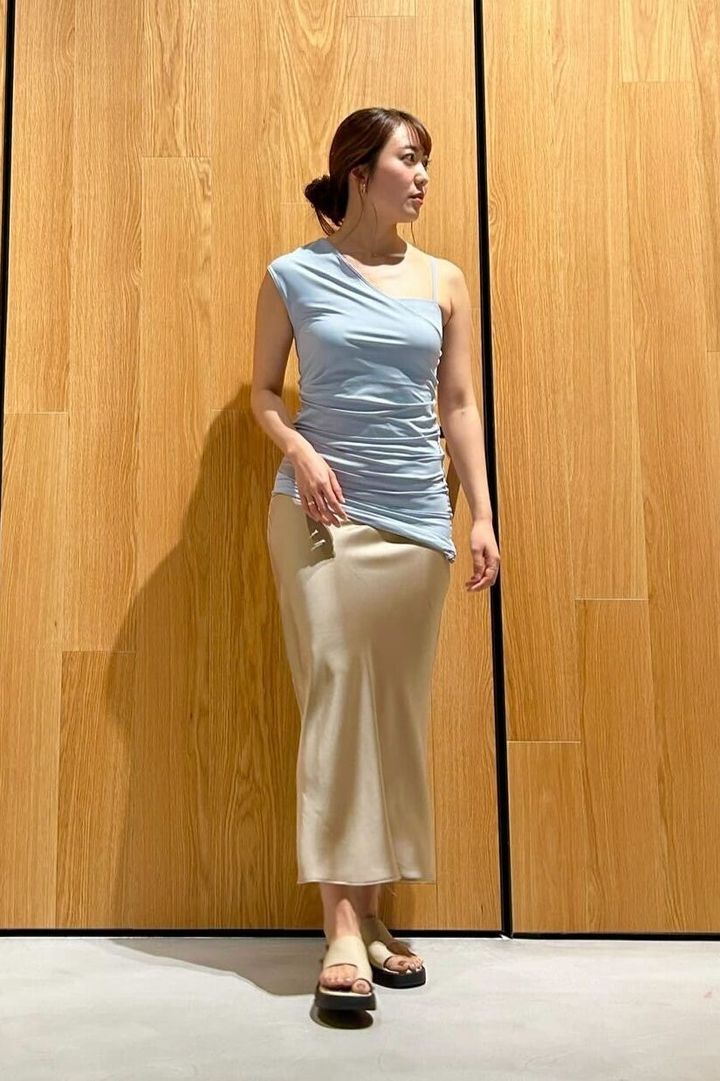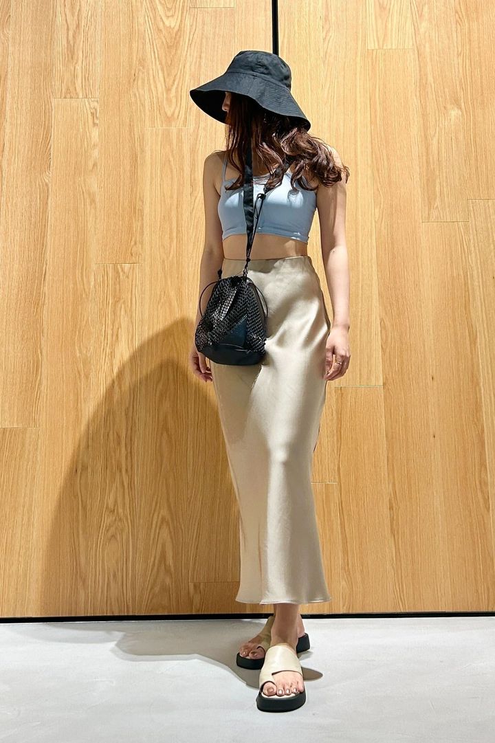 淡色のブラトップは“肌着っぽく見えるかも?”と思いきや、そんな心配はなし。リブ素材の立体感があるおかげで、普段着っぽく成立する。また、くすみブルーが肌なじみもよく、シャンパンゴールドのスカートとも好相性。