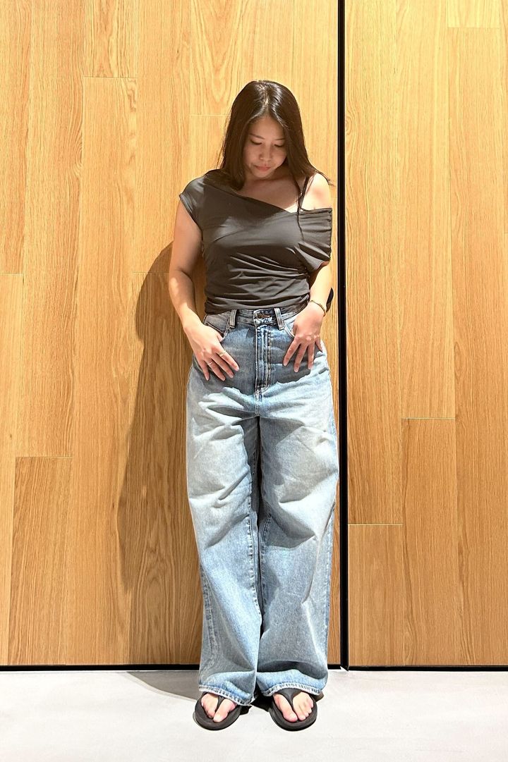 エディターは、黒の2WAYトップス×淡めのワイドデニムを合わせたカジュアルなスタイリングにしてみた。2WAY仕様のトップスは、Vネックとして着ると、ちょうどジーンズの上にくる絶妙な丈感に。