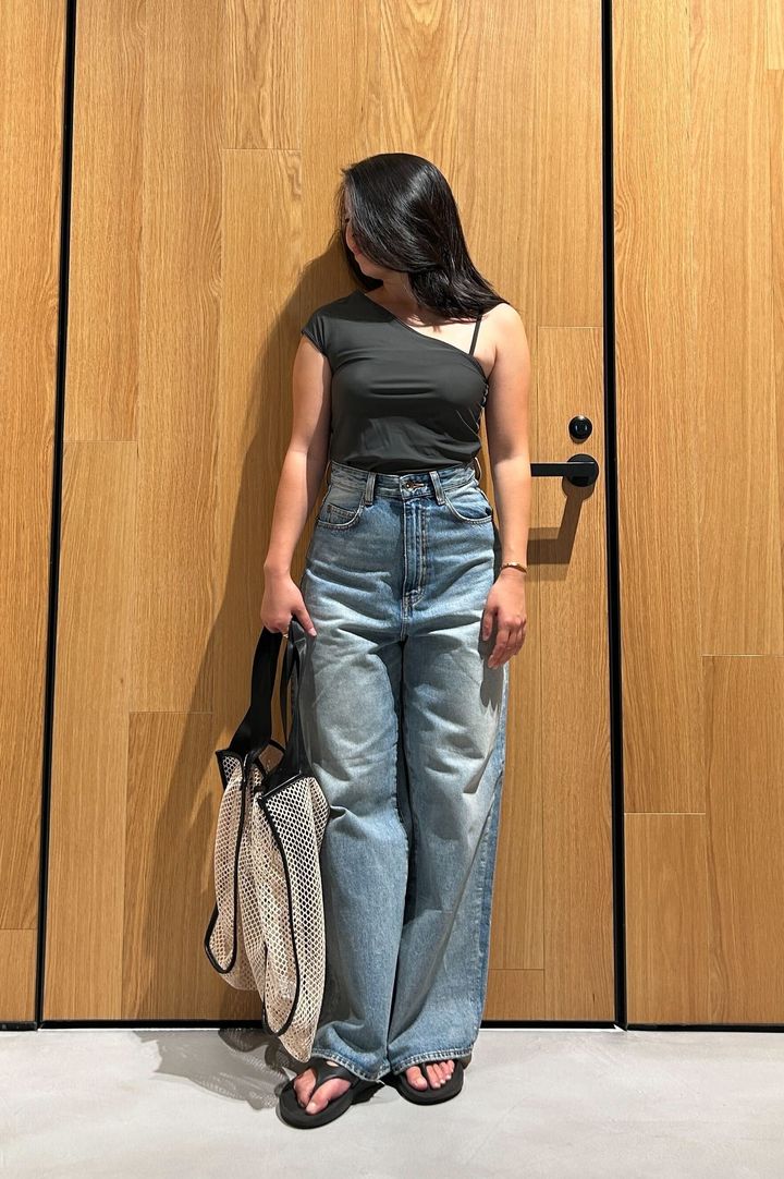 エディターは黒のトップスをロングバージョンにして、ワイドデニムにインして着用。同じ黒でもショートのときより大人っぽく、少しドレッシーな印象になった。またワンショルダーの抜け感が、夏の肌見せも品よく見せてくれる。小物でラフさを加えれば、街中でもリゾートでも馴染むスタイルに。