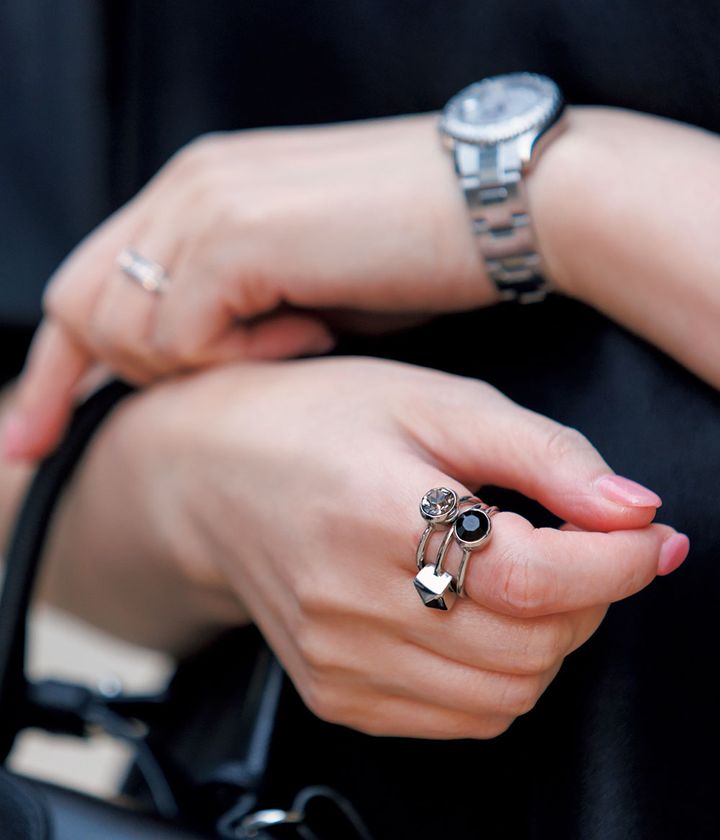 甘モノトーンが好きなのでエッジの利いたシルバーリングはバランスを調整するのに重宝しています。3本セットが1万円台で買えるお得感もたまりません(笑)。(森 あすかさん 42歳 身長155㎝ 看護師)