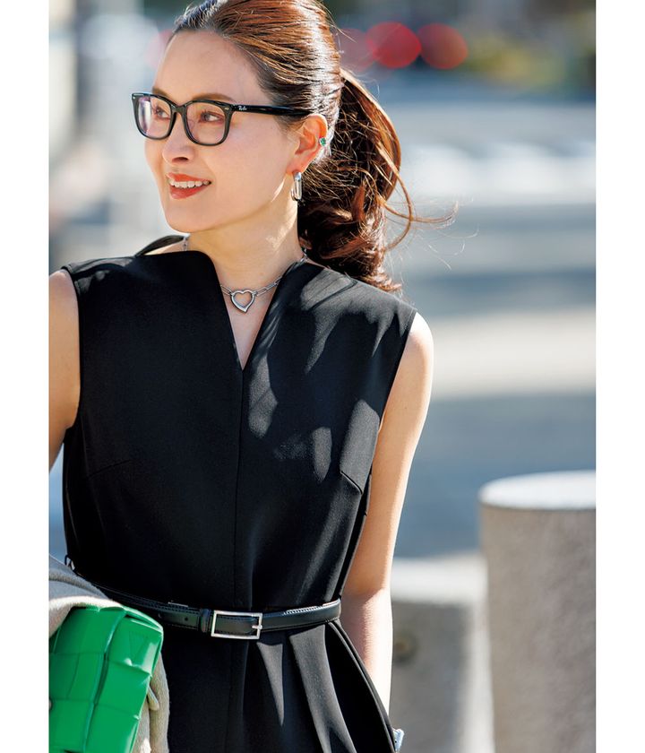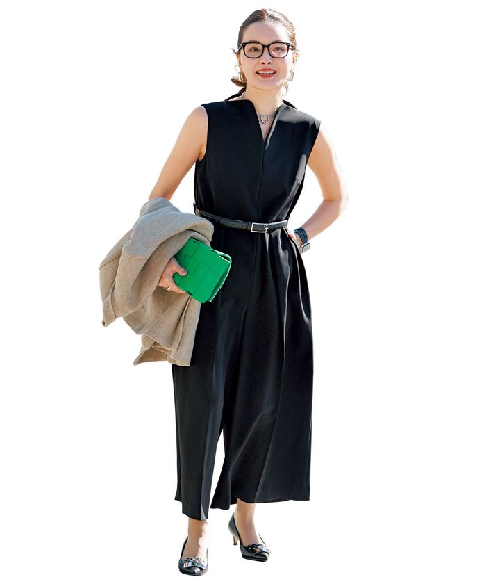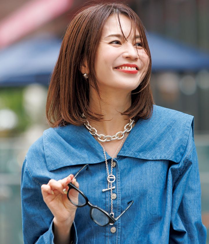 首元の開いたオールインワンにサッとプラスするだけでかっちりした仕事モードからランチ仕様に印象チェンジ。チョーカーっぽい長さも使いやすいんです。(吉川里沙さん 41歳 身長158㎝ 医師)