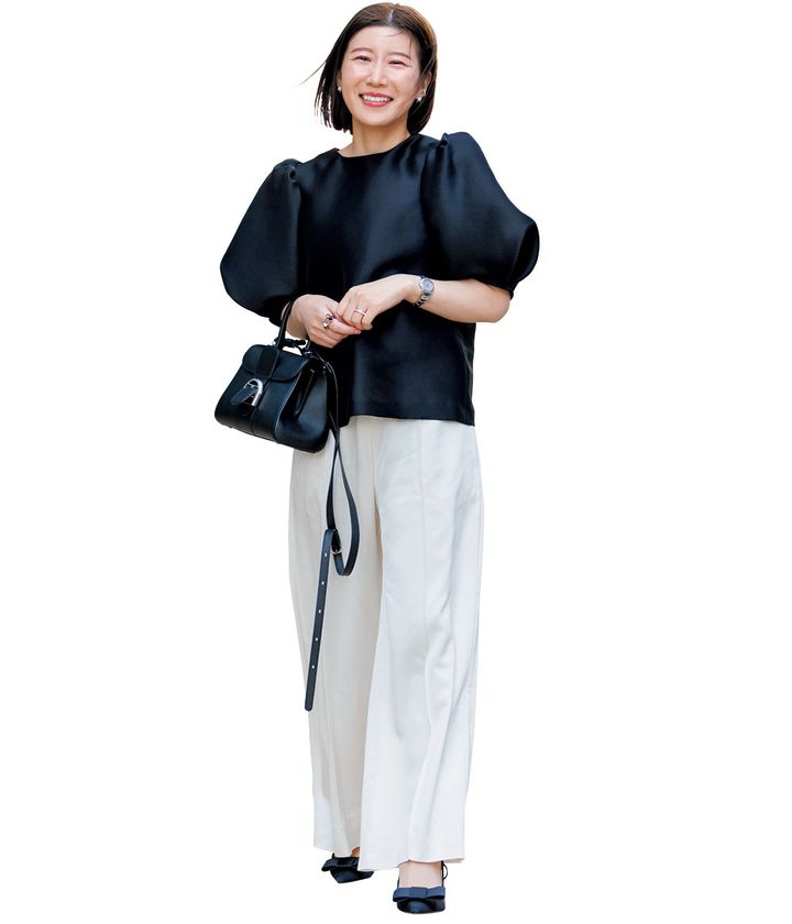 甘ブラウスはボリュームネックレスの重ねづけでアップデート。