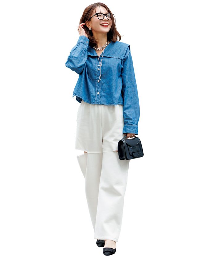 カフェランチにはデニムブラウスにスウェットパンツのキレイめカジュアルコーデで。大きめ衿が甘めなのでシルバーのネックレスをピリッと効かせます。(加藤真弓さん 43歳 身長167㎝ 主婦)