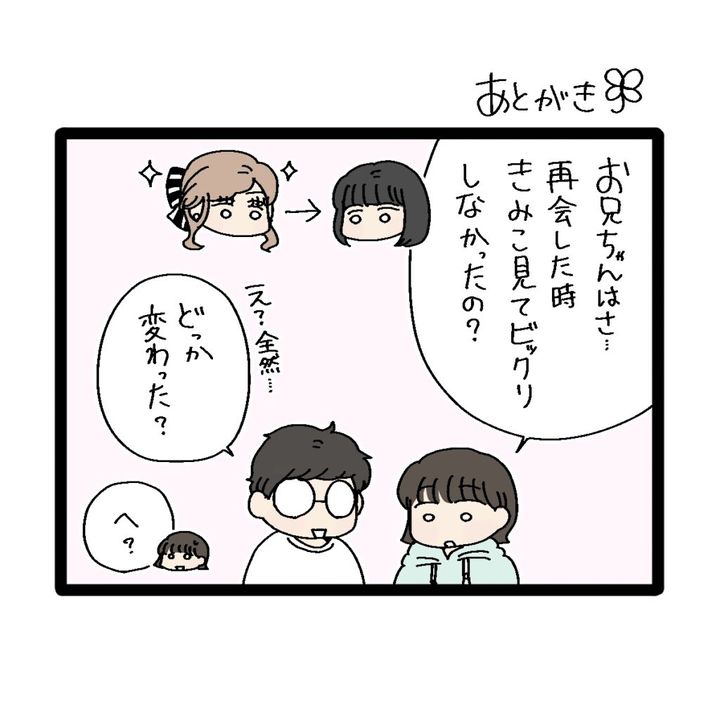 私の大切なお兄ちゃんを泣かせたら今度は絶対に許さないからね!幸せそうな兄家族を見つめながら、私は心の中でつぶやきました。でも、今のきみこの笑顔に不安はないな、と頷く私です。
