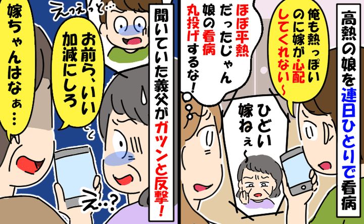 高熱の娘の看病を丸投げし義母に泣きつく夫「俺だって熱あるのに〜」ないだろ。すると聞いていた義父が