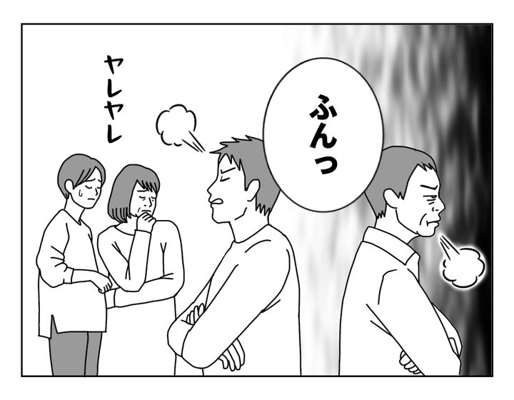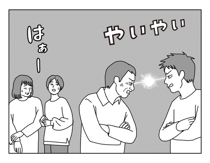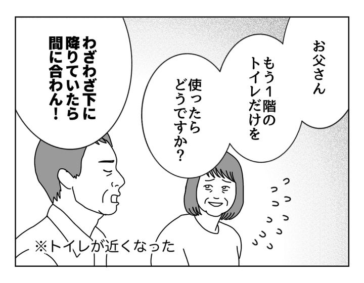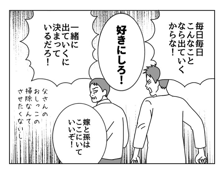 マモルさんはついに我慢の限界がきて「出ていく」と宣言。お義父さんは売り言葉に買い言葉で「出ていくならお前だけ出ていけ」と言います。お義父さんがおしっこを飛び散らかさないようにしてくれたら問題ないのですが……。立ちション派を変えるつもりはないようです。