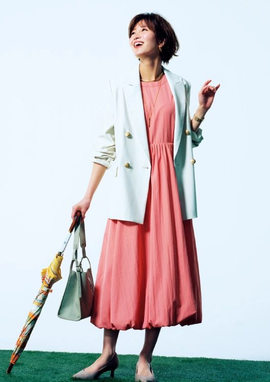 撥水ワンピ¥7,148/グローブ(ワールド)ジャケット¥38,500/アルページュストーリー 傘¥19,800/マニプリピアス¥5,280/mimi33(サンポークリエイト) ロングネックレス¥17,600/ココシュニック オンキッチュ、時計¥40,700/ココシュニック(ともにココシュニック) ネックレス¥32,400/アビステ バッグ¥8,800/オリエンタルトラフィック(ダブルエー) 撥水パンプス¥2,990/GU