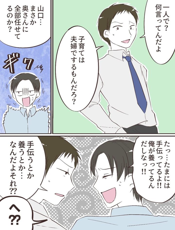 すると、「二人の子どもだそ?二人で育てるのが当たり前だろ~!!ほらほらかわいいだろ~」そう言って、子どもの写真を見せる高橋さんに、「そういや山口んとこの下の子は離乳食始まった?」と聞かれるも、「り・・!?えっと・・多分?」とまともに答えることができませんでした。
