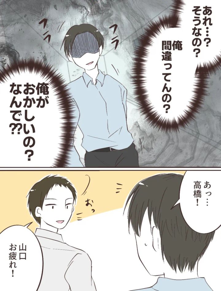 「あれ・・?そうなの?俺間違ってんの?俺がおかしいの?なんで??」とフラフラしながら歩いていると、「あっ・・高橋!」と同僚を見つけて声をかけました。「おっ山口お疲れ!」と答えた高橋さんに、