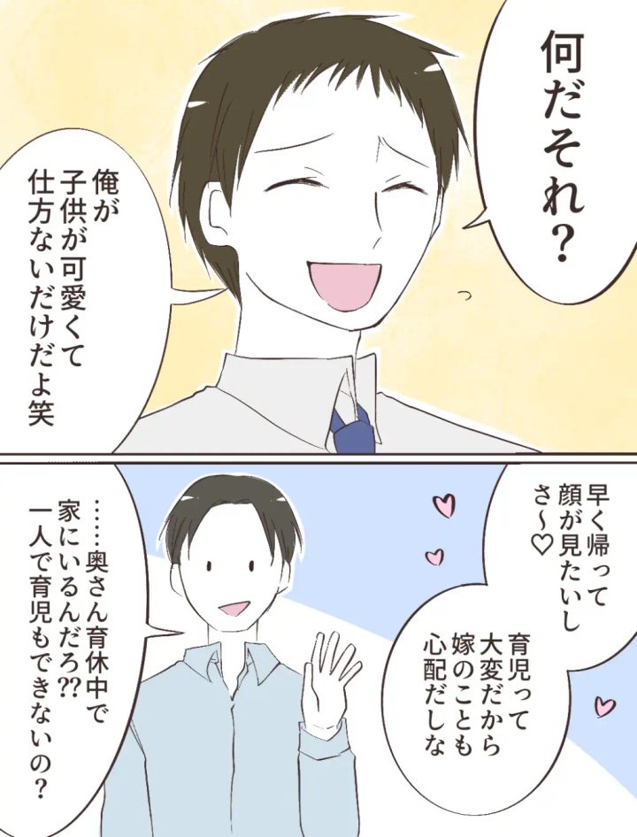 「何だそれ?俺が、子どもが可愛くて仕方ないだけだよ笑。早く帰って顔が見たいしさ~!育児って大変だから嫁のことも心配だしな」高橋さんの言葉に、「・・奥さん育休中で家にいるんだろ??一人で育児もできないの?」と目が点になりながら聞くと、