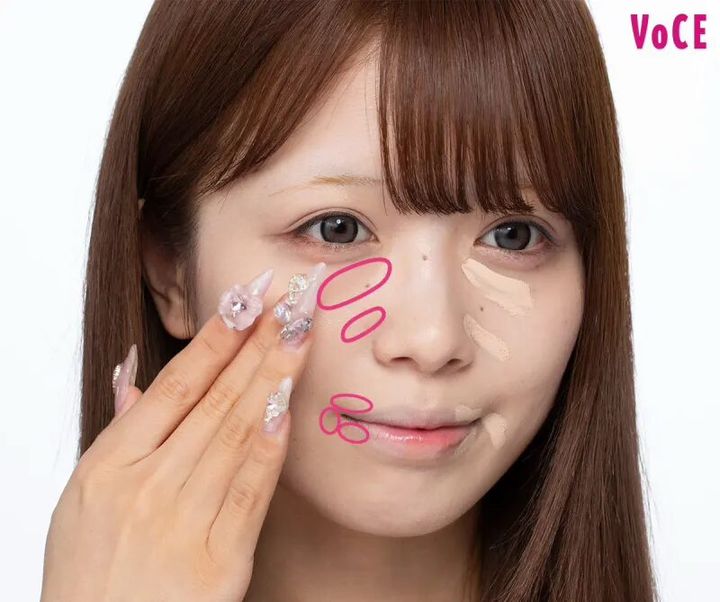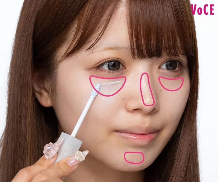 鼻・頬・顎の3点にブルーのコンシーラーを重ね、指でポンポンとなじませて透明感をオン。くすみをカバーして高さを出し、顔を立体的に見せる効果も。