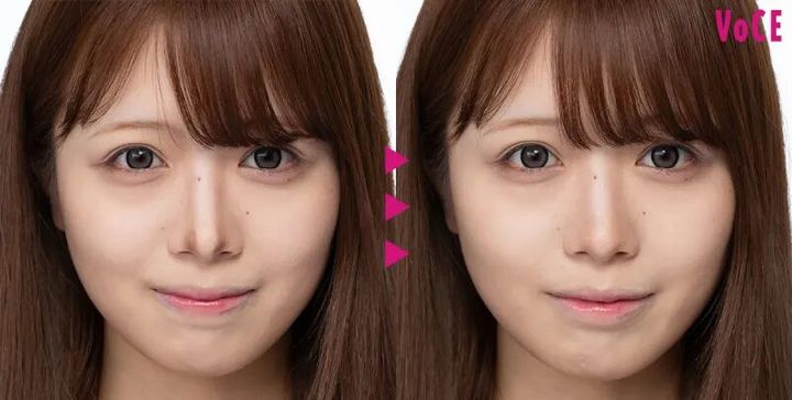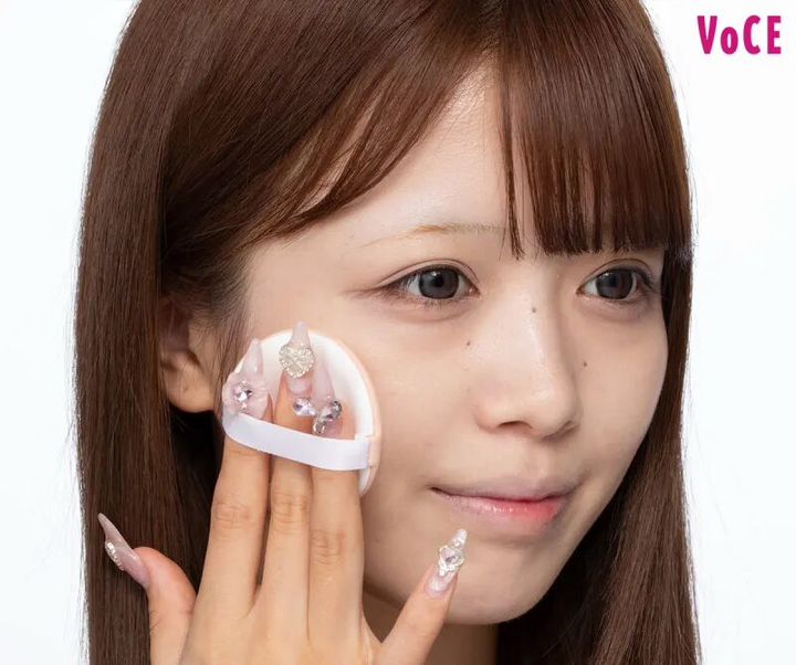 まるでつけていないかのように軽く明るめのファンデを、全顔に薄~く塗布。極薄づきながらも気になる赤みをカバーして、均一な肌へ整えてくれるのが優秀! パフにミストを吹き付けてから優しくなじませると、密着感がアップしてくずれ防止に。乾燥対策にもなるので、おすすめ。