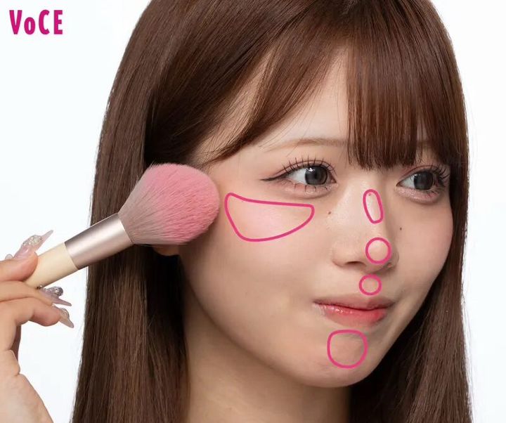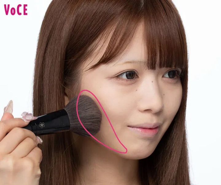 ライトなグレージュと黄みベージュを太ブラシで混ぜ、フェイスラインに沿うようにオン。ふんわりとのせるのではなくあえて濃いめにたっぷりとのせることで、動画に撮っても映えるくっきりとした小顔に。