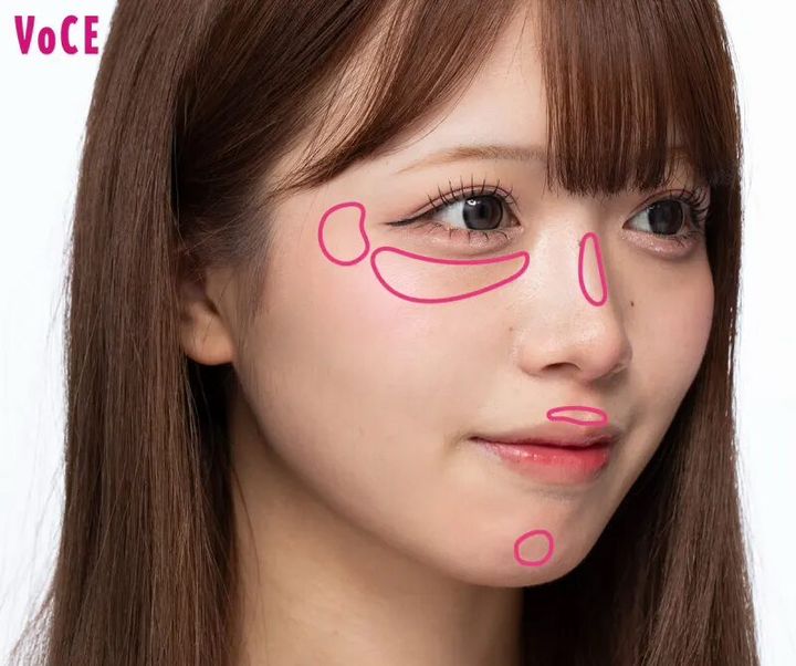 じゅんわり発光ハイライトを指に取り、鼻すじ、Cゾーン、鼻横~頬、唇の上、あごにちょんちょんと置くようにのせる。内側から湿度を感じるような、肌が元々キレイな人に!
