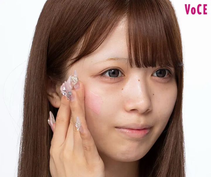 明るくて幸福感漂う肌をつくるには、血色感を演出してくれるピンク色のツヤ下地がマスト。指に取り、全顔に薄く塗り広げて。