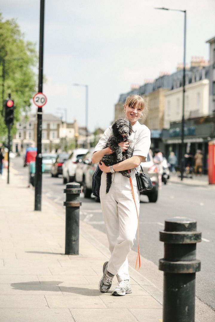 3. ホワイトコーデで愛犬とお散歩。リードの色が際立って、垢抜けコーデの完成