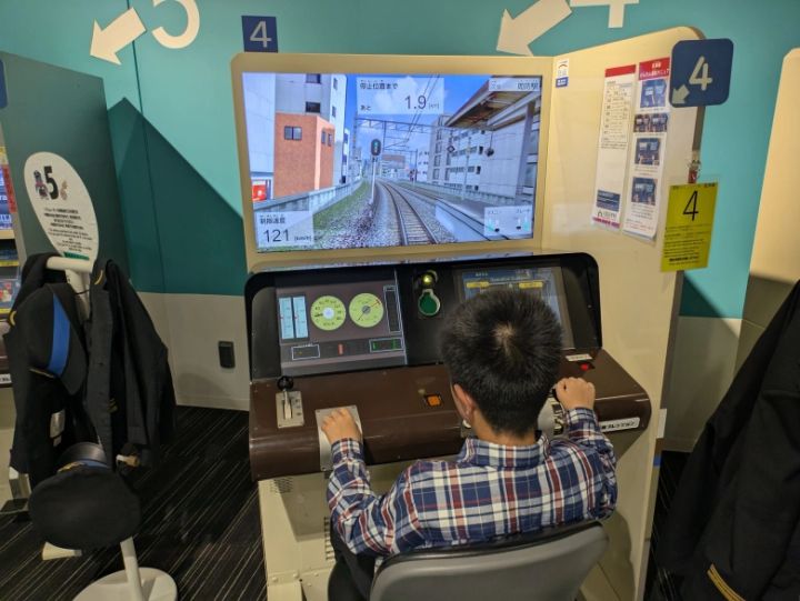 鉄道好きなら絶対に体験したい運転シミュレータ。シミュレータには新幹線と在来線の2種類があり、息子は在来線にチャレンジ。普段のゲームとは勝手が違いハンドルやブレーキの効きなど操作感が難しかったけれど楽しかったそうです。
