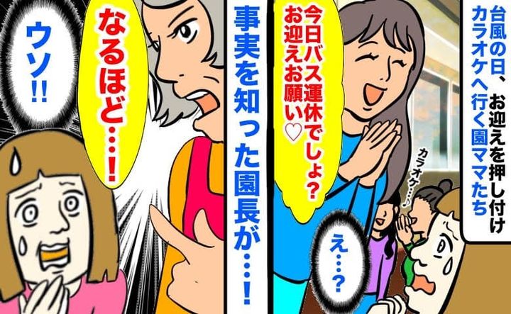 園ママ「バス運休だからお願い♡」台風の日、お迎えを押し付けカラオケに!?事実を知った園長が…!