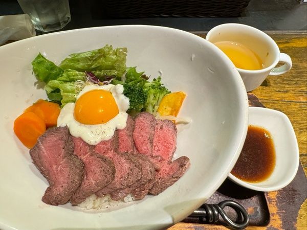 こちらがローストビーフ丼です。卵とサラダが添えられ、別添えのソースもついています。