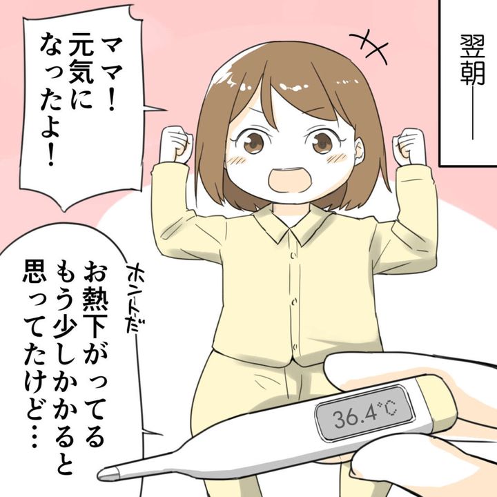 「ママ!元気になったよ!」と起き上がってママにそう言うと、「ホントだ。お熱下がってる。もう少しかかると思ってたけど・・」と体温計を見ながら驚いて言いました。