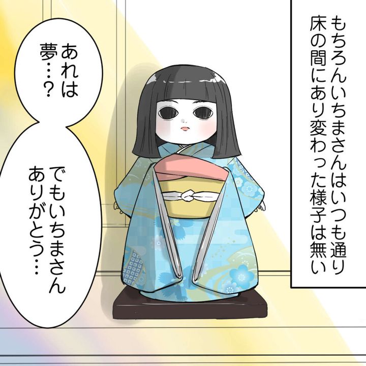 園田家に代々伝わる市松人形は「いちまさん」として大切にされていましたが、私にとっては少し怖い存在でした。ある日いちまさんを雑に扱ってしまった夜のこと、ボサボサの髪のいちまさんが、悲しいような怒っているような顔をしてマキさんの夢に現れてビックリ!その後、いちまさんの髪を櫛でときながら、大切に扱うことを誓いました。