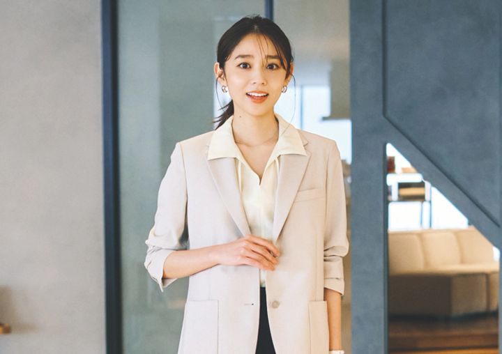 営業でNGなのは「ゆるい」格好と同時に「子ども」っぽく見えてしまうこと。仕事を任せてもらうためには、この人なら大丈夫という信頼感が何より大切。ベーシックなジャケットやきれいめパンツ、控えめカラーの小物に加え、メイクやしぐさも落ち着いた印象を与えるよう心がけます。